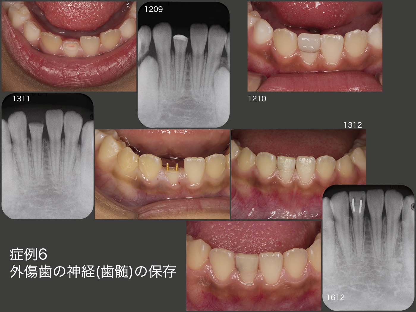 2012年9月、ブランコから落ちて右下1を破折した、当時7歳の女の子。その日はスーパーボンドという接着剤にて神経が露出した面(露髄面)を閉鎖した。なお、当院ではダッペンディッシュならびに筆をパックし、オートクレーブ滅菌した接着剤を常備している。歯の神経が保存でき、さらに退縮することを期待して10月に仮の歯を装着した。1年2ヵ月後の2013年11月、デンタルX線写真を撮影したところ、歯の神経が退縮していることを確認した。そこで歯質にピンを2本植立し、これを保持にして、保存しておいた欠けた歯を接着した。切断面がライン状に残り、審美的にはあまり美しくないが、歯の保存にとっては最良の治療法であると思う。