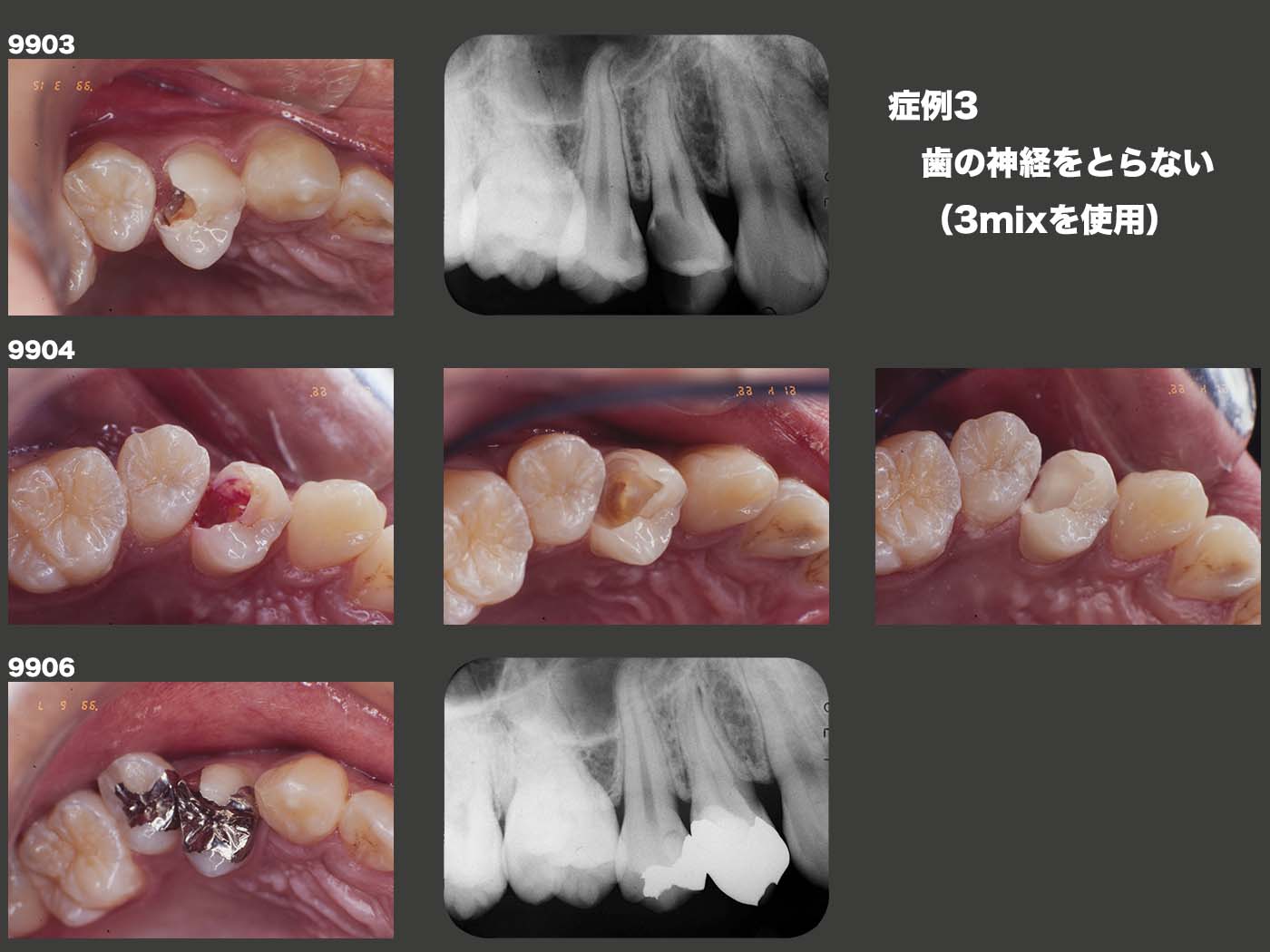 1999年3月初診、20歳男性。右上4の歯の詰め物がとれたが主訴で来院。自発痛はなかったが、デンタルX線写真から虫歯が歯の神経近くまで進行していた。このまま麻酔を施し、虫歯を取り除くと神経をとる可能性が高いことから、当時脚光を浴びていた3mixを用いた治療を行った。これは細菌を殺す三種の抗菌剤を使用している。約1ヵ月薬を塗布した後、再度残存している虫歯を除去し、接着セメントにて裏層を行ったうえで、メタルインレーを装着した。20年後の2019年、遠方にて電話での確認となるが特に問題は生じていないとのこと。