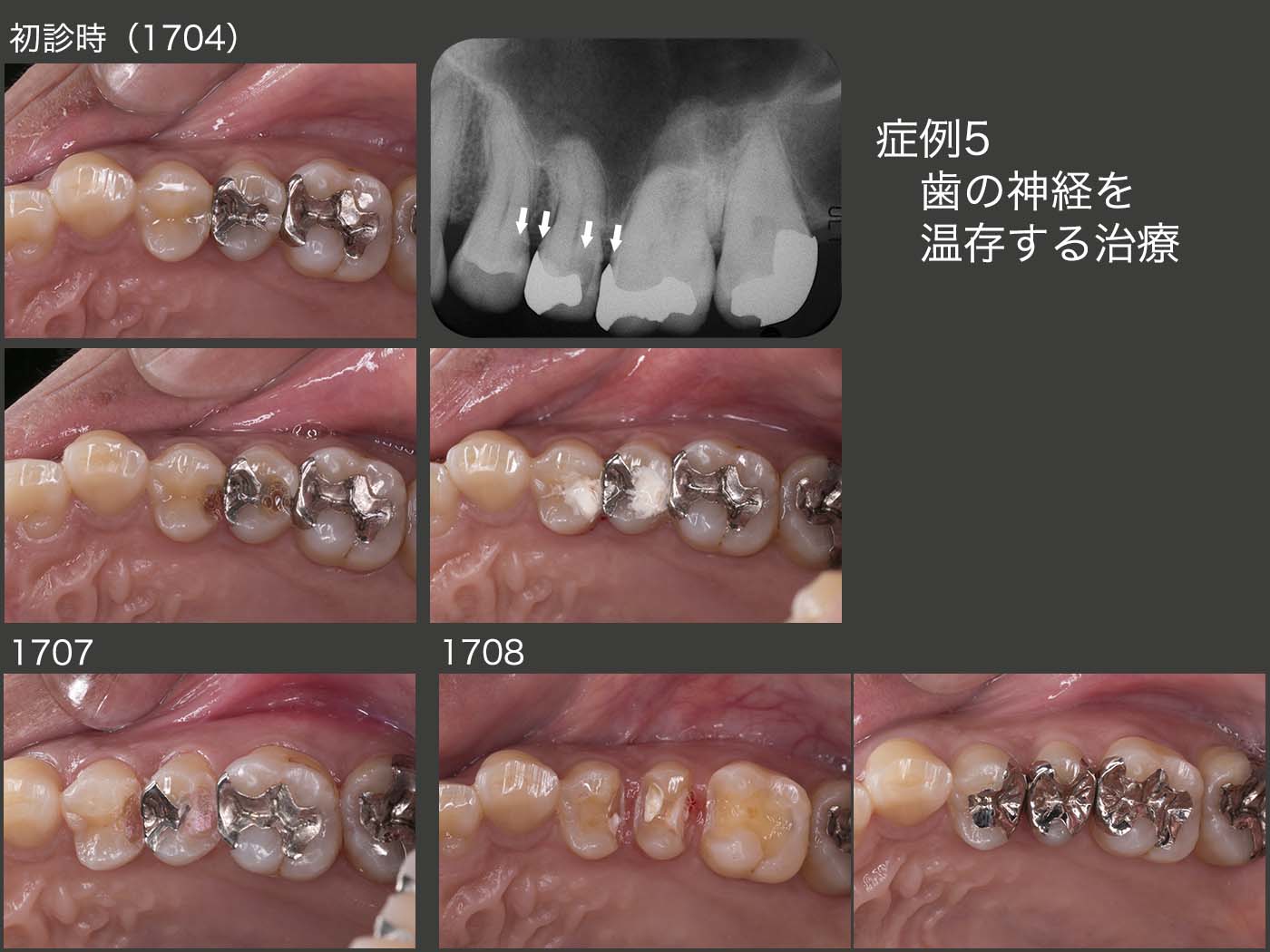 右から2番目)は、歯の神経(歯髄)に近接していた。麻酔下での虫歯の除去は、患者さんの知覚がないために歯の神経まで達してしまう危険がある。そこで、無麻酔下で患者さんが我慢できるところまでまず虫歯を除去した。(スライド中段左) つぎに、タンニン・フッ化物合剤(HY剤・ハイ-ボンド テンポラリーセメント ソフト)を貼付し、歯の神経を温存(歯髄温存療法・非侵襲性歯髄覆罩・AIPC)した。このケースでは接着性セメントにて緊密に閉鎖した。(スライド中段右) この状態で3ヵ月経過を観察。HY剤は、感染歯質の無菌化、歯質の硬化および歯の神経の退縮の効果が期待できる。これらの状態を確認し、さらに残存している虫歯を除去した。(スライド下段左) その後、通常どおり型を取って詰め物(インレー)を装着した。